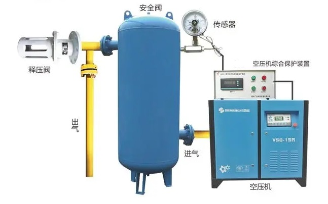 儲(chǔ)氣罐的作用是當(dāng)空壓機(jī)的排氣量不能滿足雙流體干霧主機(jī)瞬時(shí)排量要求時(shí),先將螺桿式空氣壓縮機(jī)排出的壓縮空氣儲(chǔ)存起來,以便滿足雙流體干霧主機(jī)的瞬時(shí)用氣量。儲(chǔ)氣罐包含壓力表和安全閥,進(jìn)/出氣口處需安裝消音器,排水孔安裝自動(dòng)排水閥。