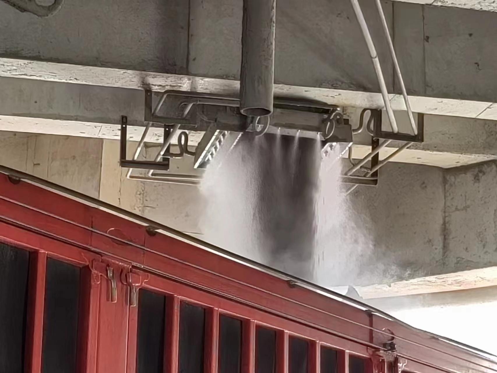 在裝車樓卸料口安裝干霧箱,根據(jù)卸料口的尺寸安裝不同型號的干霧箱,在卸料口的四周安裝干霧箱和干霧箱控制器,卸料時干霧箱開始工作,工作時形成霧池,粉塵在霧池中沉降,防止粉塵的外溢,干霧箱總成噴霧時間和周期根據(jù)現(xiàn)場情況來確定。