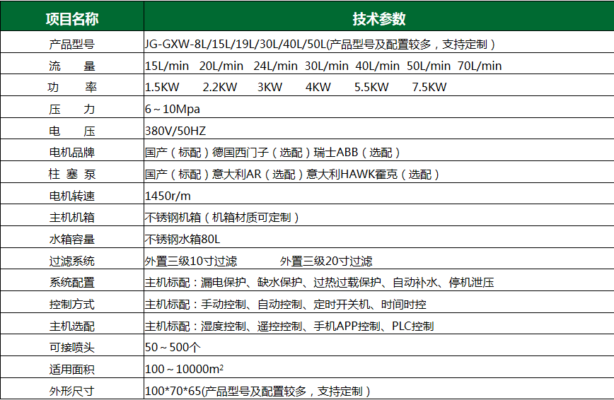 主機組成:包含過濾裝置、自動進水裝置、水箱、控制線路、變頻器、壓力變送器、動力造霧總成、缺水斷電、進水壓力表、出水壓力表、控制面板、液晶顯示屏、獨立控制系統(tǒng)等組成。 影響噴霧抑塵效果的主要因素如下: 1)霧滴對塵粒的濕潤性和附著力。 2)霧滴的粒度。 3)霧滴的速度。 4)噴霧的及時性。 技術參數(shù):