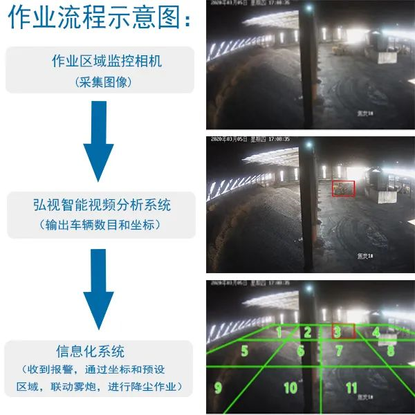 2.采用鷹眼系統(tǒng)控制霧炮機(jī)的啟停,當(dāng)汽車駛?cè)肓吓,霧炮機(jī)會跟隨汽車旋轉(zhuǎn)(XY軸),隨時做好噴霧準(zhǔn)備,當(dāng)鷹眼系統(tǒng)識別出汽車有產(chǎn)塵行為,立即啟動霧炮機(jī)噴霧;當(dāng)行車抓斗駛?cè)胂鄬?yīng)霧炮機(jī)網(wǎng)格化區(qū)域范圍,霧炮機(jī)會跟隨抓斗旋轉(zhuǎn)(XY軸),隨時做好噴霧準(zhǔn)備,當(dāng)鷹眼系統(tǒng)識別出抓斗有產(chǎn)塵行為,立即啟動霧炮機(jī)噴霧。通過光纖網(wǎng)絡(luò)將抑塵設(shè)備接入平臺系統(tǒng),實現(xiàn)抑塵設(shè)備的運行和控制信號聯(lián)通。為確保信號穩(wěn)定傳輸,布設(shè)的光纖網(wǎng)絡(luò)需穩(wěn)定可靠,并且富有冗余。鷹眼系統(tǒng)服務(wù)器安裝在破煤主控室,圖像回放儲存不少于1個月,鷹眼攝像頭需有自動清潔功能,具有樓梯、平臺等方便日常維護(hù)攝像頭的基礎(chǔ)設(shè)施。