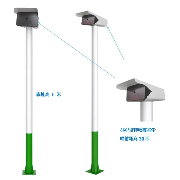 1.智能高壓霧樁由機(jī)頭部件、電桿部件、水路系統(tǒng)和電氣控制系統(tǒng)四部分組成霧樁噴淋系統(tǒng)。目前,國內(nèi)霧樁噴霧設(shè)備較好的是99智能環(huán)保等環(huán)保企業(yè)。霧樁除塵可達(dá)到360個°(±180°)旋轉(zhuǎn)噴霧具有防風(fēng)、防雨、防塵等功能,滿足現(xiàn)場作業(yè)需要。在高溫天氣下,噴霧可以吸收空氣中的熱量,降低路面溫度,降低人的干熱感。